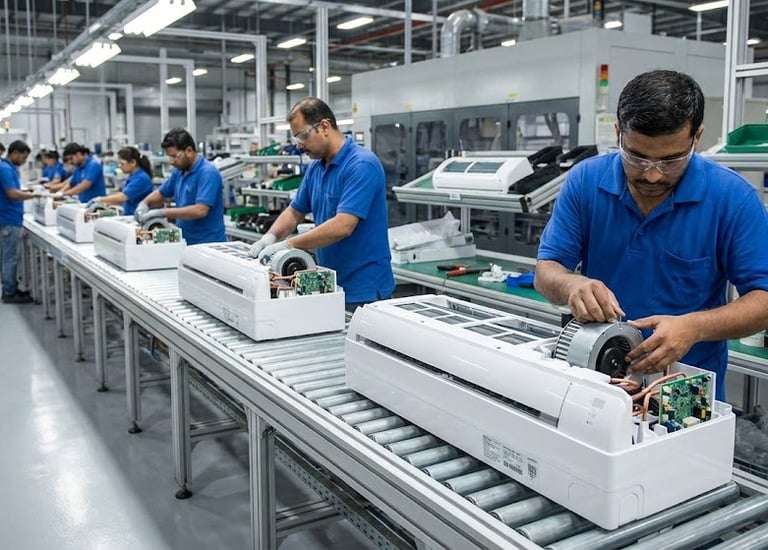 A Split Type Air Conditioner Assembly Unit is a promising MSME project focused on assembling indoor and outdoor AC units used in homes, offices, shops, and commercial spaces. With rising temperatures, urbanization, and increasing demand for energy-efficient cooling solutions, the market for split ACs is growing rapidly in India. The project involves assembly of compressors, copper tubing, cooling coils, electrical components, and testing. It requires moderate investment, trained technicians, and quality control systems. Eligible under PMEGP subsidy schemes, this project offers strong seasonal sales, brand tie-up opportunities, and long-term profitability in the consumer electronics sector.