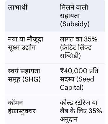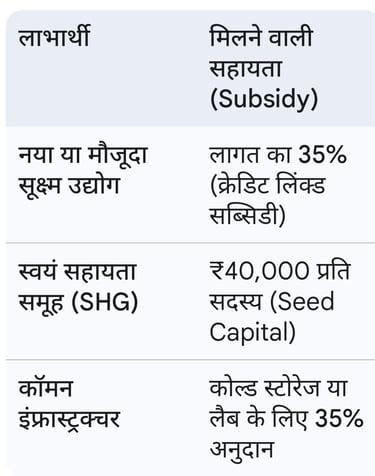 * किसे मिलेगा लाभ: व्यक्तिगत उद्यमी, स्वयं सहायता समूह (SHG), FPO और सहकारी समितियां।